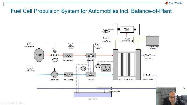 Con Simscape, equipos de ingeniería pueden personalizar un modelo completo de pila de combustible PEM. Eso incluye el stack de pilas de combustible y los componentes de equilibrio de planta, tales como compresores de aire, humidificadores, vías de recirculación de hidrógeno, sistemas de refrigeración y gestión del agua. Este modelo de pila de combustible basado en principios básicos que utiliza electroquímica permite desarrollar una pila de combustible PEM en el nivel de componente y de sistema. Este nivel de detalle del modelo de pila de combustible permite modelar funcionalidades tales como monitorización de corriente, tensión y potencia, y gestión térmica.