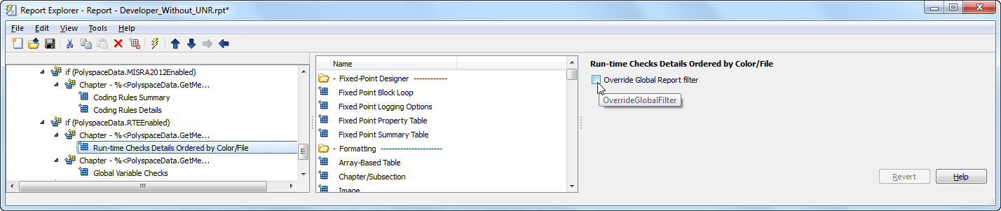 Report Customization (Filtering)located under Polyspace in the middle pane and place it above the Title Page component. The positioning of the component ensures that the filters apply to the full report and not one chapter of the report.