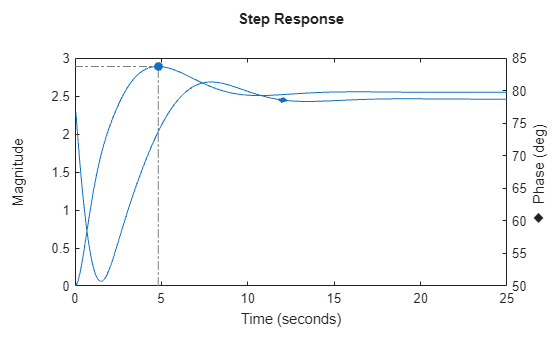 For complex responses, rise time is computed based on the projection of the response onto the ray that connects the initial output value to the final output value. To view this projection, show the response on the complex plane and enable the rise-time characteristic. For clarity, remove the peak response display.