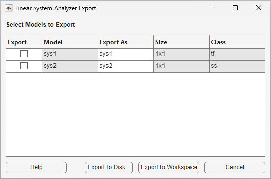 To export models from Linear System Analyzer, select File > Export. The Linear System Analyzer Export dialog box opens.