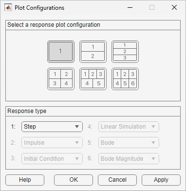 To interactively specify the types of responses to plot, in Linear System Analyzer, select Edit > Plot Configurations. The Plot Configurations dialog box opens.