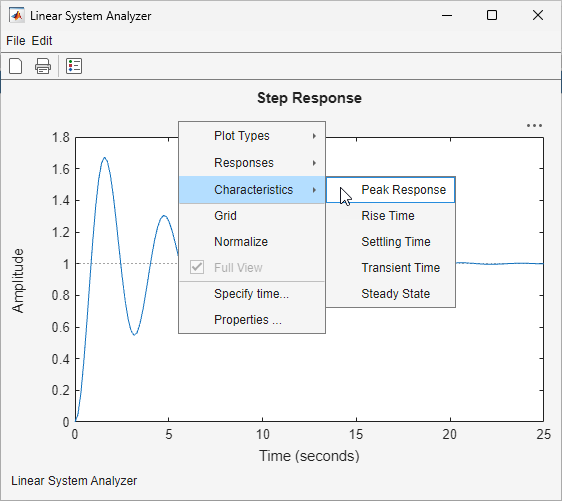 To display response characteristics in a response plot, right-click the plot area and, under Characteristics, select a characteristic to display. You can display multiple characteristics on the same plot.
