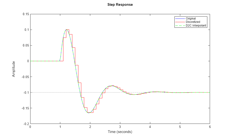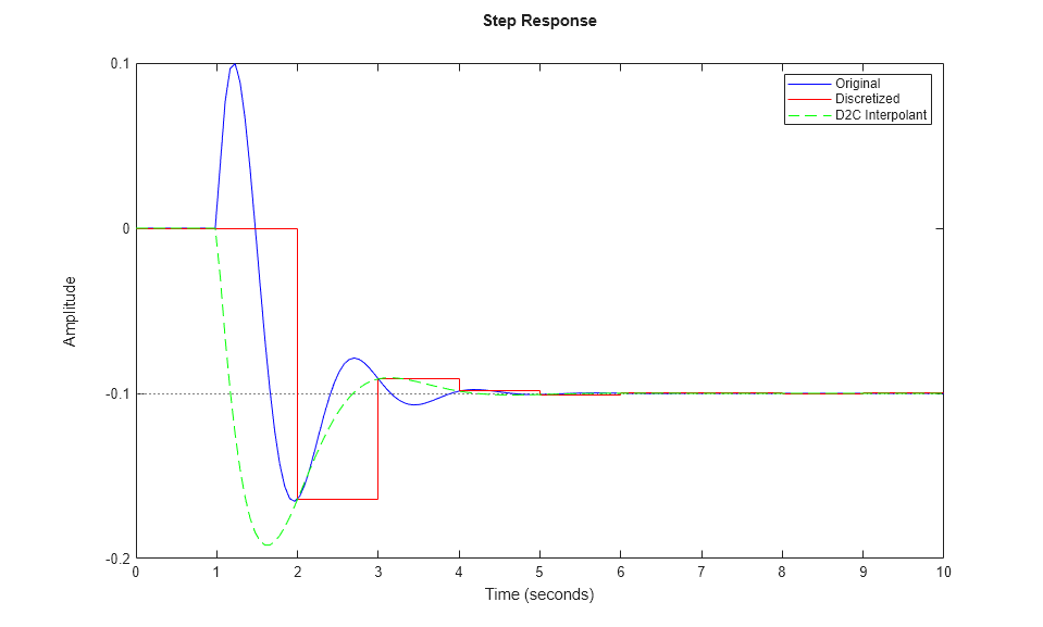 Gc = d2c(Gd); step(G,'b',Gd,'r',Gc,'g--') legend('Original','Discretized','D2C Interpolant')