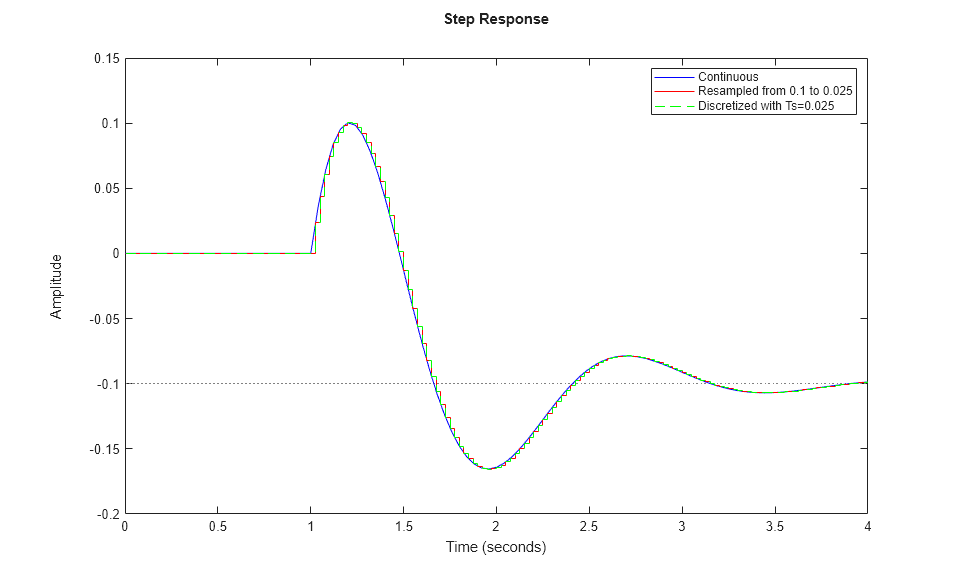 step(G,'b',Gr,'r',c2d(G,0.025),'g--',4) legend('Continuous','Resampled from 0.1 to 0.025','Discretized with Ts=0.025')