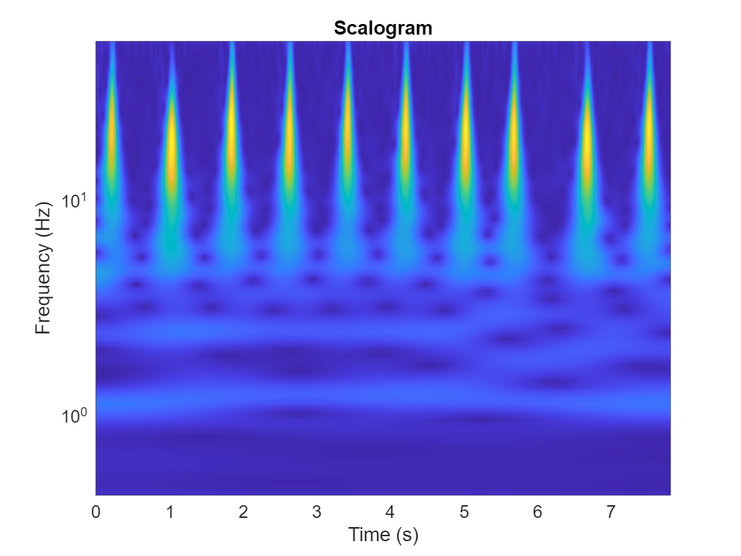 Fs = 128; fb = cwtfilterbank(SignalLength=1000, ... SamplingFrequency=Fs, ... VoicesPerOctave=12); sig = ECGData.Data(1,1:1000); [cfs,frq] = wt(fb,sig); t = (0:999)/Fs; figure pcolor(t,frq,abs(cfs)) set(gca,"yscale","log") shading interp axis tight title("Scalogram") xlabel("Time (s)") ylabel("Frequency (Hz)")
