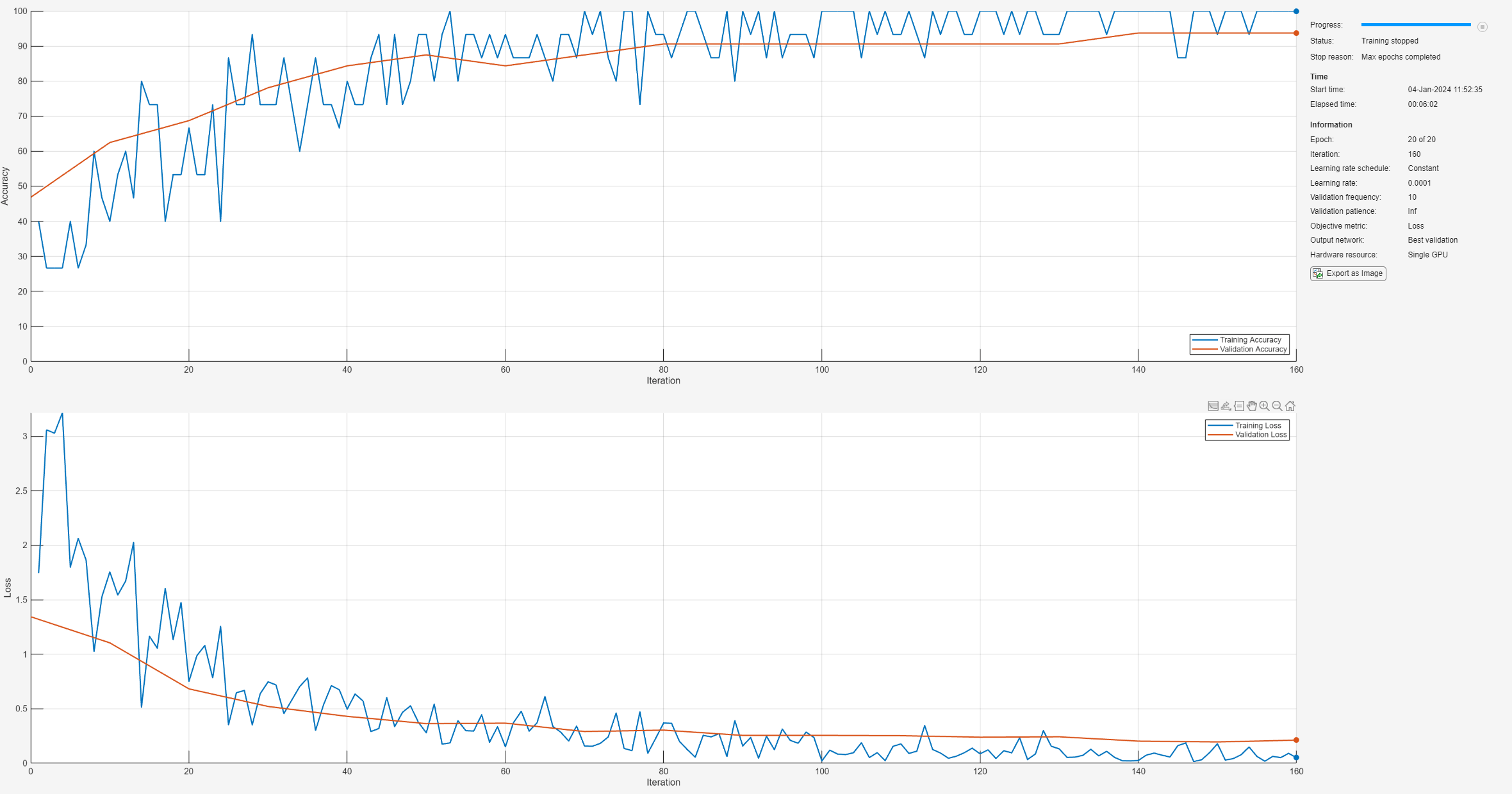 options = trainingOptions("sgdm", ... MiniBatchSize=15, ... MaxEpochs=20, ... InitialLearnRate=1e-4, ... ValidationData=imgsValidation, ... ValidationFrequency=10, ... Verbose=true, ... Plots="training-progress", ... Metrics="accuracy");