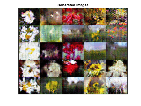 epoch = 0; iteration = 0; % Loop over epochs. while epoch < numEpochs && ~monitor.Stop epoch = epoch + 1; % Reset and shuffle data. shuffle(mbq); % Loop over mini-batches. while hasdata(mbq) && ~monitor.Stop iteration = iteration + 1; % Read mini-batch of data. [X,T] = next(mbq); % Generate latent inputs for the generator network. Convert to % dlarray and specify the dimension labels "CB" (channel, batch). % If training on a GPU, then convert latent inputs to gpuArray. Z = randn(numLatentInputs,miniBatchSize,"single"); Z = dlarray(Z,"CB"); if (executionEnvironment == "auto" && canUseGPU) || executionEnvironment == "gpu" Z = gpuArray(Z); end % Evaluate the gradients of the loss with respect to the learnable % parameters, the generator state, and the network scores using % dlfeval and the modelLoss function. [~,~,gradientsG,gradientsD,stateG,scoreG,scoreD] = ... dlfeval(@modelLoss,netG,netD,X,T,Z,flipFactor); netG.State = stateG; % Update the discriminator network parameters. [netD,trailingAvgD,trailingAvgSqD] = adamupdate(netD, gradientsD, ... trailingAvgD, trailingAvgSqD, iteration, ... learnRate, gradientDecayFactor, squaredGradientDecayFactor); % Update the generator network parameters. [netG,trailingAvgG,trailingAvgSqG] = ... adamupdate(netG, gradientsG, ... trailingAvgG, trailingAvgSqG, iteration, ... learnRate, gradientDecayFactor, squaredGradientDecayFactor); % Every validationFrequency iterations, display batch of generated images using the % held-out generator input. if mod(iteration,validationFrequency) == 0 || iteration == 1 % Generate images using the held-out generator input. XGeneratedValidation = predict(netG,ZValidation,TValidation); % Tile and rescale the images in the range [0 1]. I = imtile(extractdata(XGeneratedValidation), ... GridSize=[numValidationImagesPerClass numClasses]); I = rescale(I); % Display the images. image(I) xticklabels([]); yticklabels([]); title("Generated Images"); end % Update the training progress monitor. recordMetrics(monitor,iteration, ... GeneratorScore=scoreG, ... DiscriminatorScore=scoreD); updateInfo(monitor,Epoch=epoch,Iteration=iteration); monitor.Progress = 100*iteration/numIterations; end end