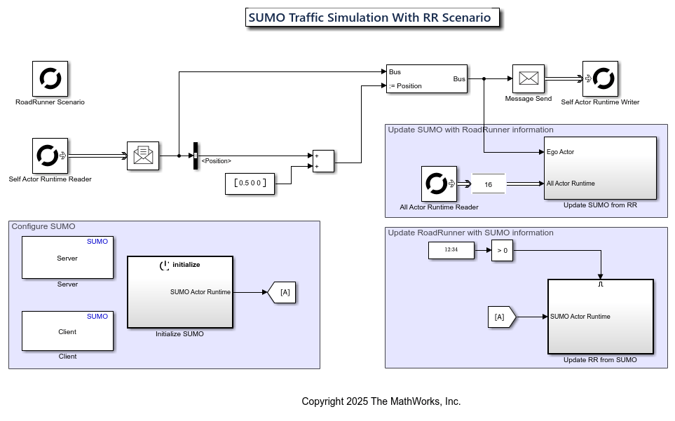 Integrating SUMO with RoadRunner Scenario combines the traffic simulation capabilities of SUMO with the 3D visualization environment of RoadRunner, enabling synchronized traffic flow, coordinated ego vehicle behavior, and realistic automated driving scenario development. This example demonstrates how to use the SUMO traffic simulation blocks from the Automated Driving Toolbox™ Interface for Eclipse SUMO Traffic Simulator support package to perform cosimulation by adding and synchronizing traffic between both SUMO and RoadRunner Scenario simulation platforms, maintaining consistent ego vehicle control, and visualizing real-time interactions between traffic generated in SUMO and RoadRunner.