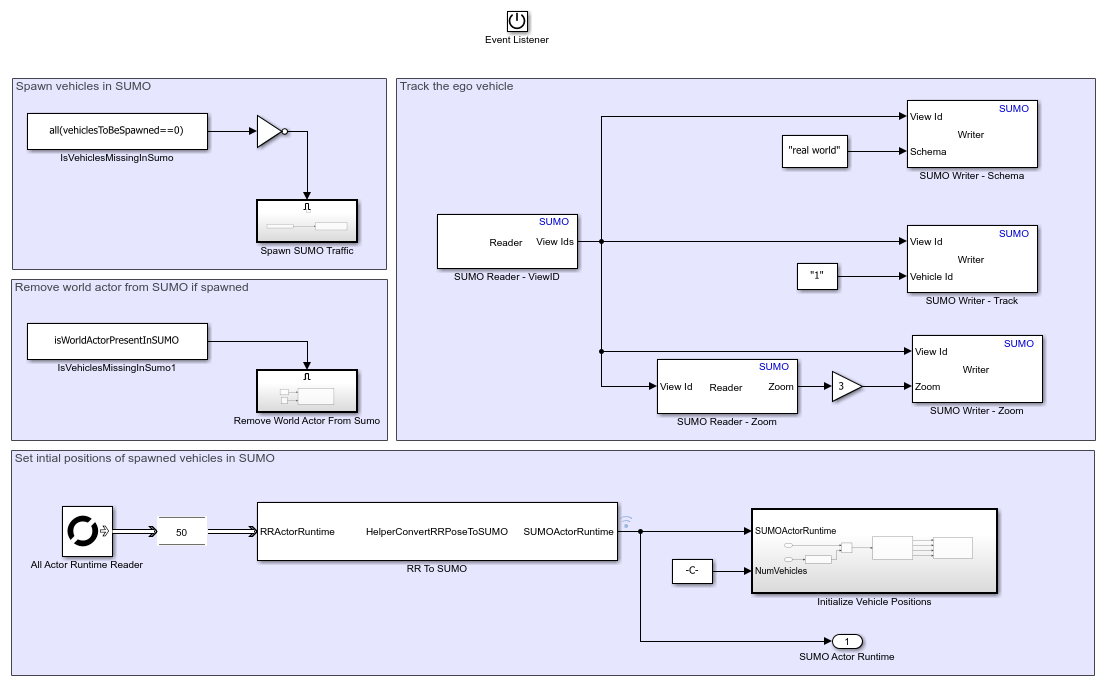 The Initialize SUMO subsystem uses the Actor and Writer blocks to initialize SUMO by spawning the traffic and defining the actor positions, respectively. Open the Initialize SUMO subsystem.
