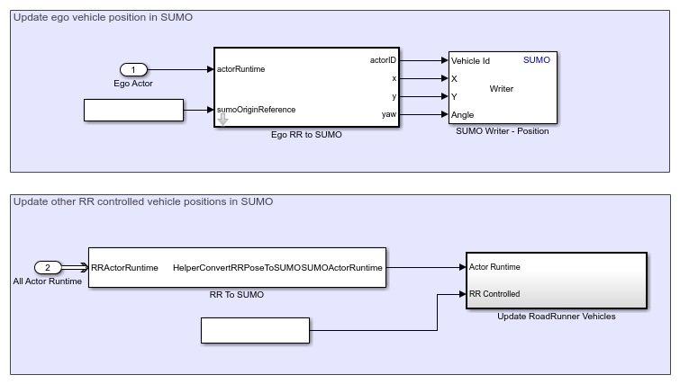 The HelperConvertRRPoseToSUMO System object converts the positions of RoadRunner vehicles to the SUMO coordinate system, and the Update RoadRunner Vehicles subsystem updates them in SUMO. Open the Update RoadRunner Vehicles subsystem.