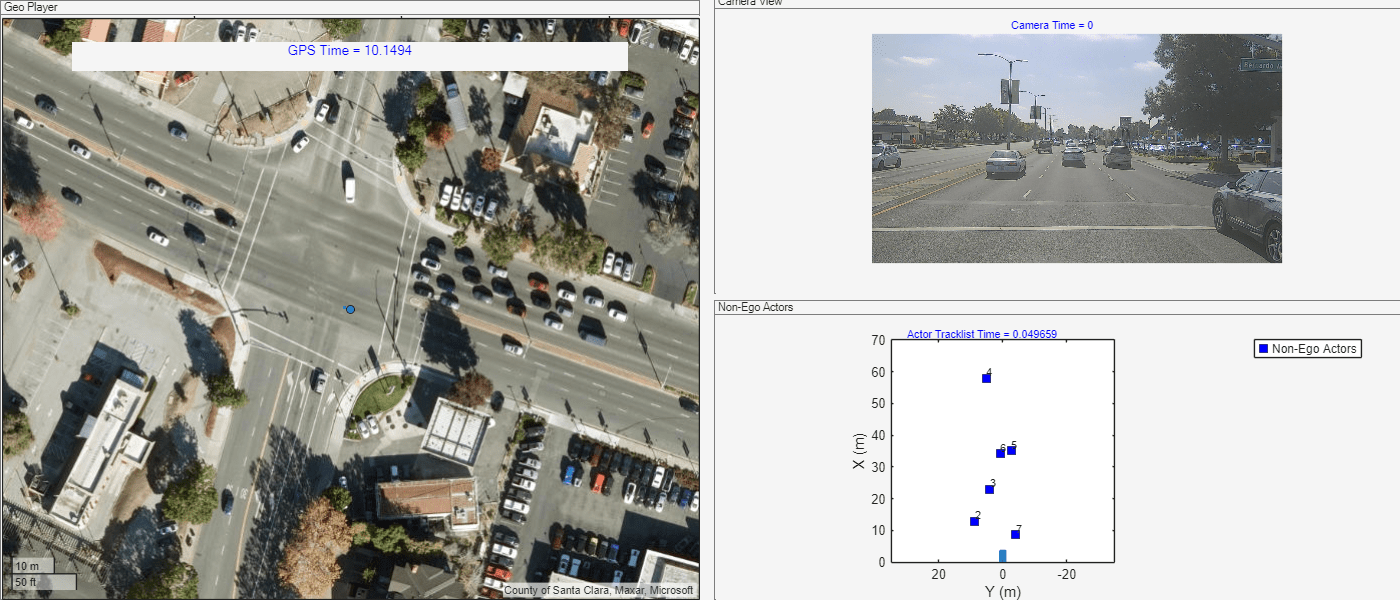 fh = figure(Visible="on",Position=[0 0 1400 600]); % First plot: Geo Player geoPlot = uipanel(fh,Position=[0 0 0.5 1],Title="Geo Player"); geoPlayer = geoplayer(gps.Latitude(1),gps.Longitude(1),19, ... Parent=geoPlot,HistoryDepth=Inf,Basemap="satellite"); gpsTimeLabel = uicontrol(Style="text",Parent=geoPlot, ... Units="normalized",Position=[0.1 0.9 0.8 0.05], ... FontSize=10,HorizontalAlignment="center", ... String="GPS Time = ",ForegroundColor=[0 0 1]); gpsPlotData = {gps,geoPlayer,gpsTimeLabel}; % Second plot: Camera View camPlot = axes(uipanel(fh,Position=[0.51 0.51 0.5 0.5],Title="Camera View")); camPlotData = {cam,camPlot}; % Third plot: Non-Ego Actors hPlot = axes(uipanel(fh,Position=[0.51 0 0.5 0.5],Title="Non-Ego Actors")); bep = birdsEyePlot(XLim=[0 70],YLim=[-35 35],Parent=hPlot); actorListPlotData = {actorList,bep}; skipFrames =10; helperViewMultiSensorData(gpsPlotData,camPlotData,actorListPlotData,skipFrames)