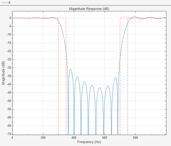 Generate MATLAB function>Digital Filter Object. The code appears in the Editor.function designedFilter = bandstopfir1filt designedFilter = designfilt('bandstopfir', ... 'FilterOrder',40,'PassbandFrequency1',300, ... 'StopbandFrequency1',350,'StopbandFrequency2',700, ... 'PassbandFrequency2',750,'SampleRate',2000, ... 'DesignMethod','ls','PassbandWeight1',3, ... 'StopbandWeight',15); end