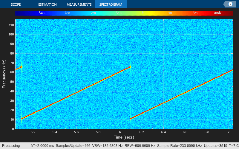Previously, spectrum analyzer required a minimum number of samples to update the display for a given RBW value. Starting in R2024b, this limitation is removed. The scope now updates its display for any number of input samples and adjusts the RBW value accordingly.