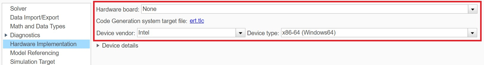 • In the Hardware Implementation pane, set the Device vendor parameter to Intel. Set the Device type parameter to x86-64(Windows 64) or x86-64(Linux 64) based on your desktop environment.