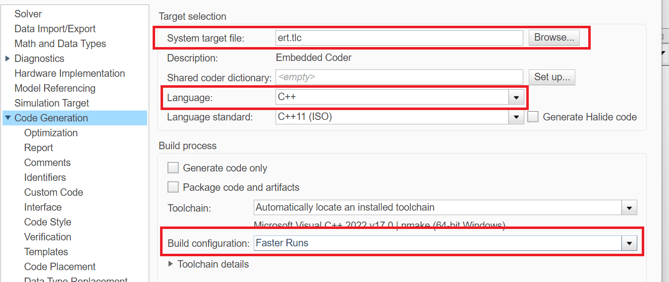 Select 'ert.tlc' as the system target file to optimize the code for embedded real-time systems, 'C++' as the target language and choose 'Faster Runs' for the build configuration to prioritize execution speed.