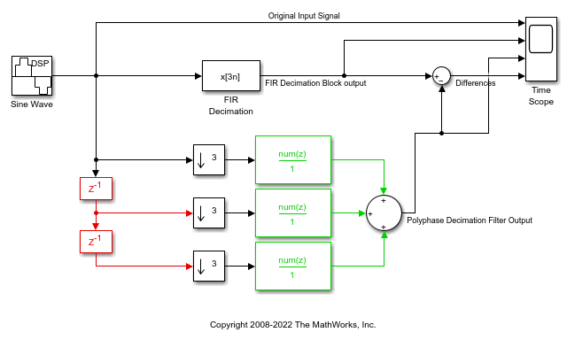 - Sine Wave | FIR Decimation | Time Scope | Discrete FIR Filter (Simulink) | Delay (Simulink) | Downsample