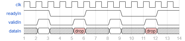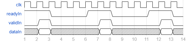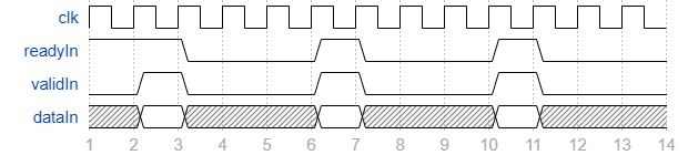 If you wait to detect ready high before releasing the next data sample, you could lower your throughput. This waveform shows a system that sends one data sample the cycle after ready goes high. The throughput is one sample every five cycles, although the block takes only four cycles to process a sample.