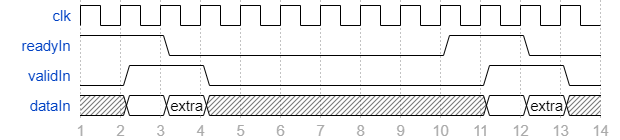 If the upstream part of your design has multiple data samples available and synchronously reacts to the block setting ready low, then one extra cycle of input data can arrive at the port. To support synchronous control logic, such as the HDL FIFO (HDL Coder) block in Classic mode, the block reserves room to store this extra data while processing the current data and does not set ready high until it processes the additional input data. This waveform shows a system that synchronously releases data in response to ready. The block accepts one extra cycle of data even though ready is low, and does not set ready high again until it has processed both inputs. The block returns the output data in its usual pattern. The throughput is two samples every eight cycles, the same overall rate as above.