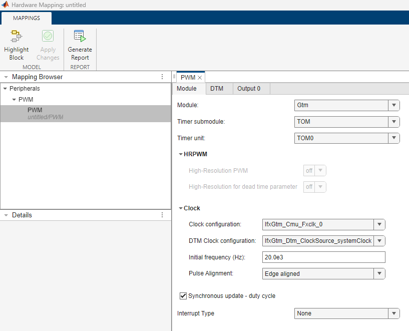 PWM.The PWM Global parameters are available only if more than two PWM blocks are used in the model. For more, see Map Tasks and Peripherals Using Hardware Mapping.