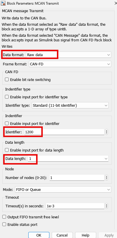 2. Double-click the MCAN Transmit block and confirm that the Data format is set to Raw data, Identifier to 1200, and Data length to 1 byte.