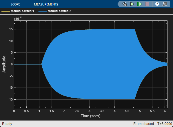 The input is a monotone sine wave. Based on the "Go" command at the first second and "Stop" command at fifth second, you can see the output waveform transitions that slowly fades-in and fades-out respectively.
