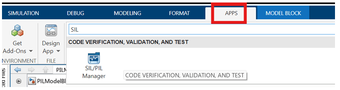 3. In the Simulink toolstrip, click Apps and then select SIL/PIL Manager.