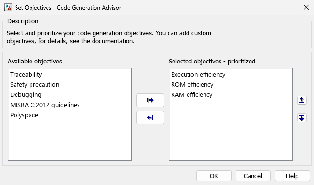 For this example, configure the model to generate C code that you can deploy on your host computer as an example target, prioritizing execution efficiency, then ROM efficiency, then RAM efficiency.