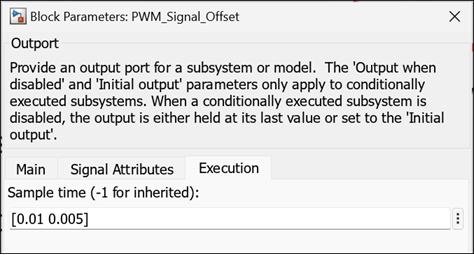 This model has a base sample rate of 1e-4 second. The sample time of the root inport ports are specified as inherited. The model has two outports. The first is set to inherit its sample time information and the second has a specified sample time of 0.01 second and offset of 0.005 second. All sample times are specified by setting the value of Sample time field within the execution tab of the inport block dialog box.