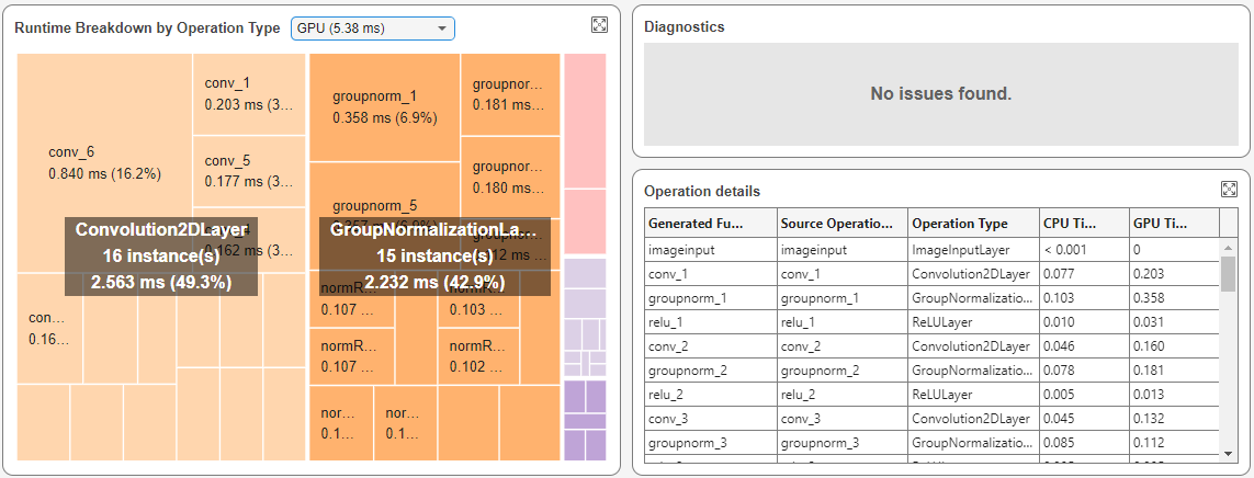 To identify bottlenecks that decrease the network efficiency, use the Runtime Breakdown by Operation Type, Diagnostics, and Operation details panes to examine the layer-level metrics. You can use these panes to identify bottlenecks, visualize layer-level performance, and view the performance data for each layer in the network.