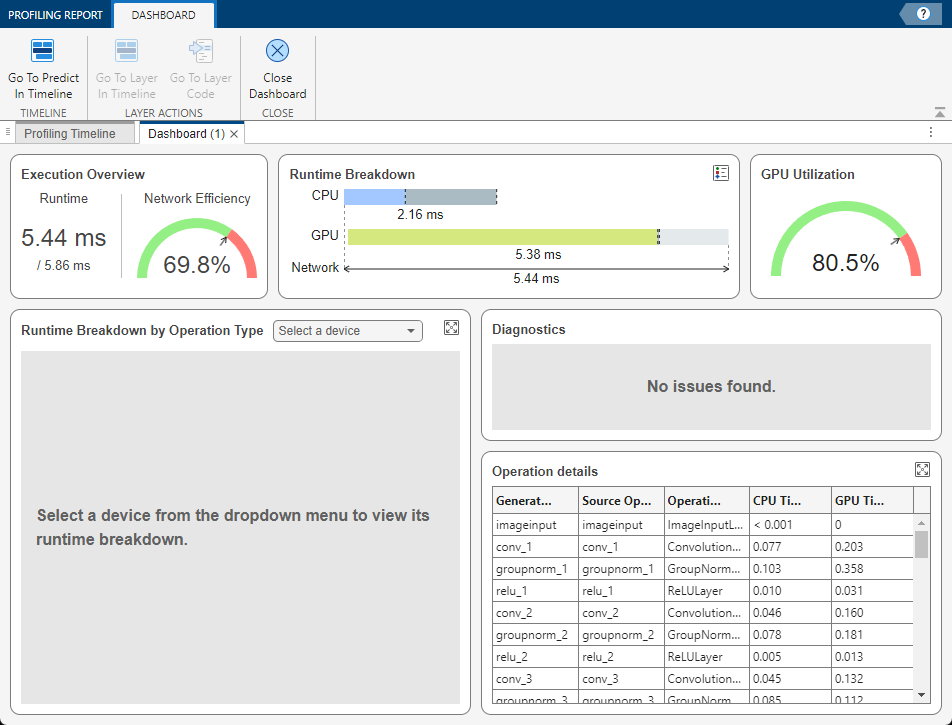 The dashboard summarizes the network execution, runtime, and GPU utilization. Use the Execution Overview, Runtime Breakdown, and GPU Utilization panes to assess the performance of the network.