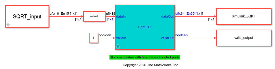 The SqrtLUT block computes the square root of an input signal by using a look-up table (LUT) and piecewise linear interpolation. Use this block for fixed-point signal processing applications where you need a high-speed square root operation with low latency and minimal resource usage. The SqrtLUT block normalizes input values outside the range [0,1] and then computes the square root by using piecewise linear interpolation based on the values in a lookup table. Finally, the block rescales the interpolated result and outputs it. For more information, see Compute Square Root Using Look-up Table Approach.