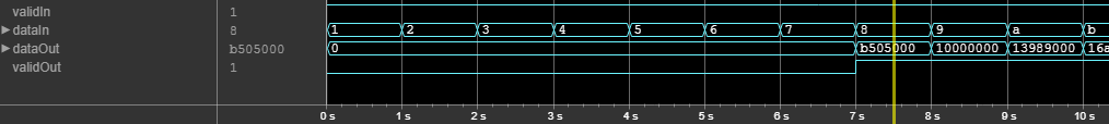 This figure shows the simulation waveform for the model. You can see that dataOut output is valid when validOut is 1, which is after 7 cycles.