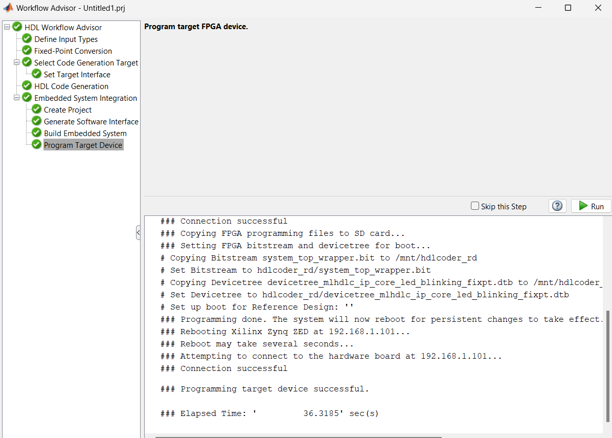 Run the modified script and observe the LED blink frequency changing on the hardware. Additionally, in the gs_mlhdlc_ip_core_led_blinking_fixpt_interface.m script uncomment this line and run the script to observe the changes in the data_Read_back variable in the MATLAB workspace.