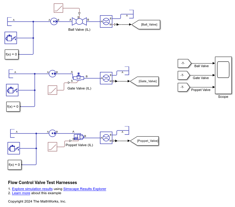 This example uses test harnesses to compare the Ball Valve (IL), Gate Valve (IL), and Poppet Valve (IL) blocks. A test harness is a minimum viable model that you can use to parameterize blocks or isolate dynamics.