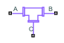 The T-Junction (MA) block represents a three-way pipe junction with a branch line at port C connected at a 90° angle to the main pipe line, between ports A and B. You can specify a custom junction or a junction that uses a Rennels correlation or Crane correlation loss coefficient. When Loss coefficient model is set to Custom, you can specify the loss coefficients of each pipe segment for converging and diverging flows.