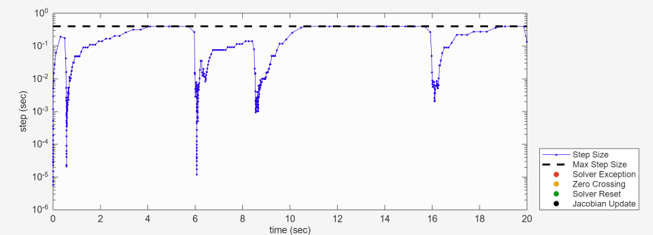 The average step-size is larger than 0.1 s for most of the simulation, but when the spool valve changes position the step size shrinks to between 1e-3 and 1e-5 s. Because the solver profiler shows no issues with the model at these tolerances, you can use the tolerance as a basis for the sample time when running in the model in fixed-step.