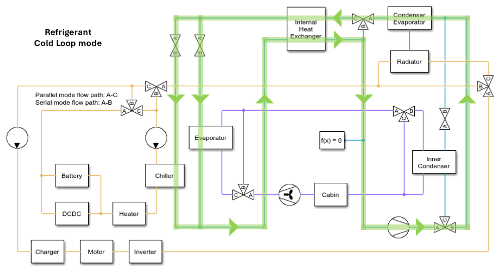 The figure below highlights the refrigerant loop in cold loop mode. The condenser evaporator acts as a condenser to reject heat to the environment. The chiller expansion valve meters refrigerant to the chiller to cool the coolant. The evaporator expansion valve meters refrigerant to the evaporator to cool and dehumidify the cabin air.
