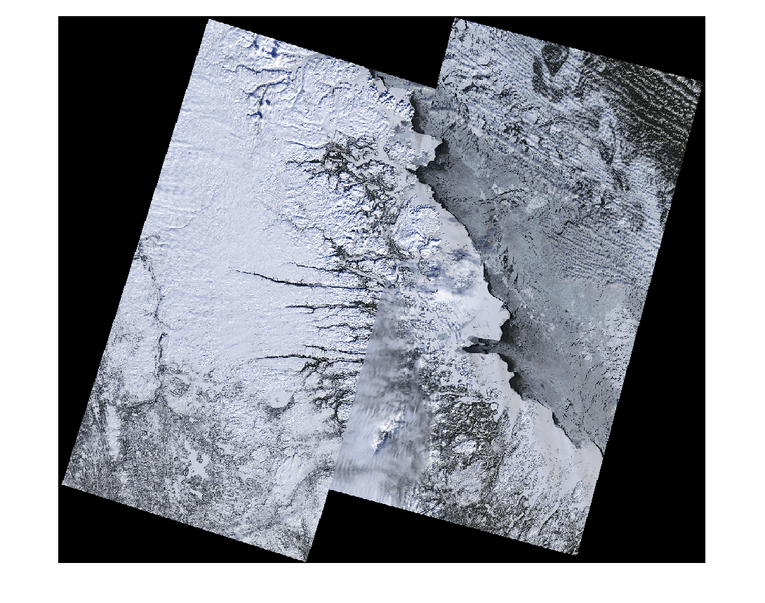 This example uses four Landsat 9 multispectral tile images that cover a contiguous area of the eastern part of Quebec, Canada, near the western shore of the Labrador Sea. The tiles are approximately temporally consistent, but not radiometrically or atmospherically corrected. You can apply preprocessing such as cloud masking or surface normalization, if required for your application.