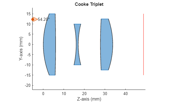 This example shows how to design a Cooke triplet lens system. This example requires the Optical Design and Simulation Library for Image Processing Toolbox™. You can install the Optical Design and Simulation Library for Image Processing Toolbox from Add-On Explorer. For more information about installing add-ons, see Get and Manage Add-Ons.