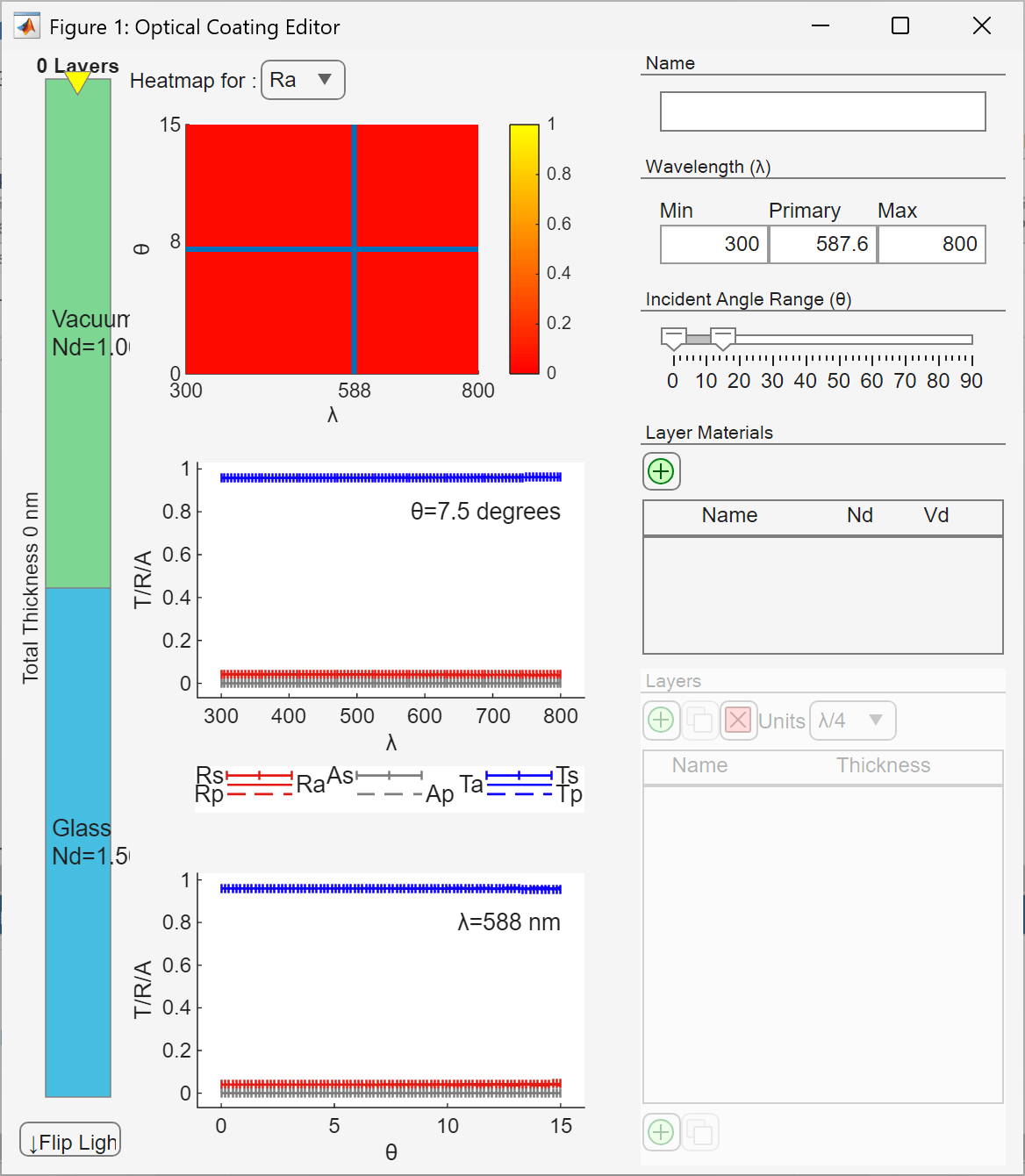 function coatingResponseApp(oc) arguments oc (1,1) opticalCoating end angles = 0:1:45; lambda = 400:10:600; fig = uifigure(Name="Coating Optical Response Visualizer",Position=[200 50 1000 700]); mainGrid = uigridlayout(fig,[1 2]); mainGrid.ColumnWidth = {"2x","1x"}; h = opticalCoatingEditor(Parent=mainGrid,Coating=oc); ax = uiaxes(mainGrid); ax.Title.String = "Reflection Power Coefficient"; ax.XLabel.String = "Wavelength (nm)"; ax.YLabel.String = "Incident Angle (deg)"; ax.ZLabel.String = "Ra"; ax.PlotBoxAspectRatio = [1 1 1]; coeffs = fresnelCoefficients(h.Coating,IncidentAngles=angles,Wavelengths=lambda); hLiveSurf = surf(ax,lambda,angles,coeffs.Ra) h.CoatingChangedFcn = @(hObj,~) updateRaPlot(hObj,hLiveSurf,angles,lambda); function updateRaPlot(h,hLiveSurf,angles,lambda) coeffs = fresnelCoefficients(h.Coating,IncidentAngles=angles,Wavelengths=lambda); set(hLiveSurf,"ZData",coeffs.Ra) end end