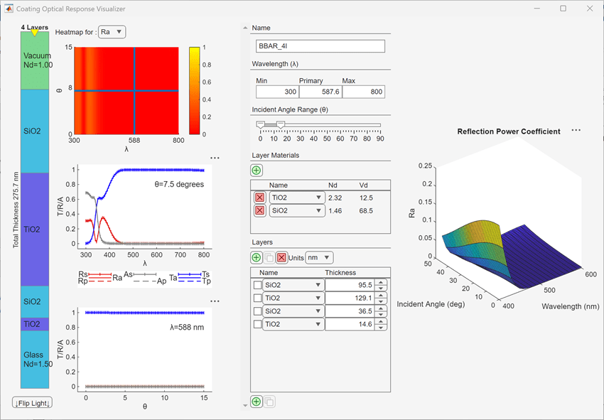 opticalCoatingEditorin the first column of the UI figure, and a surface plot ofRa, the average power reflection coefficient, in the second column.Set the