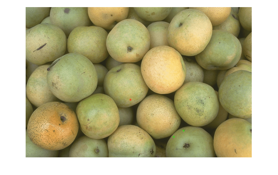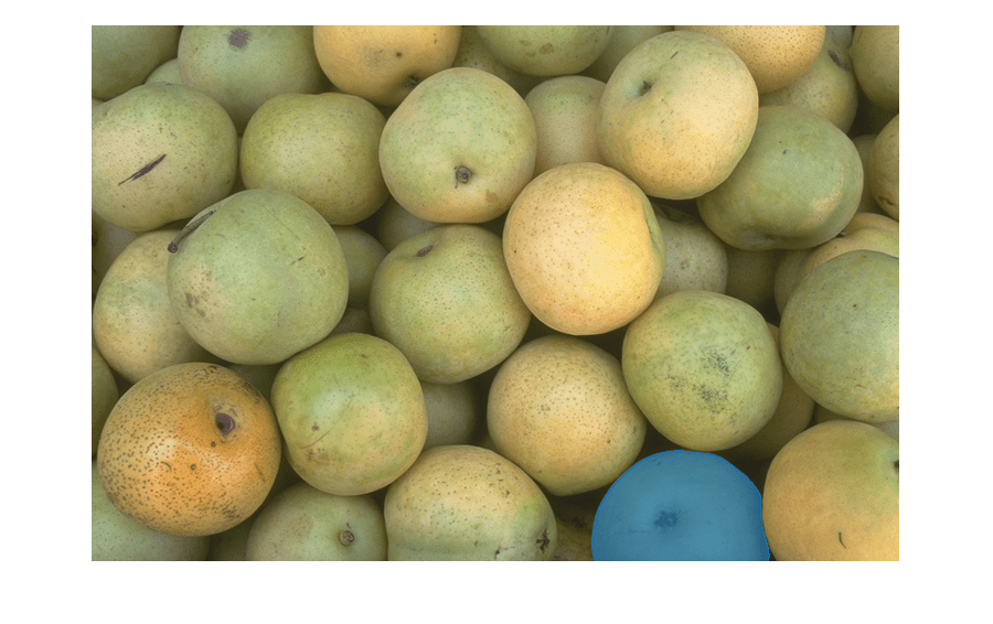 Specify visual prompts corresponding to the object that you want to segment, such as a pear along the bottom edge of the image. This example selects two foreground points within the pear. Refine the segmentation by including one background point outside the object to segment.