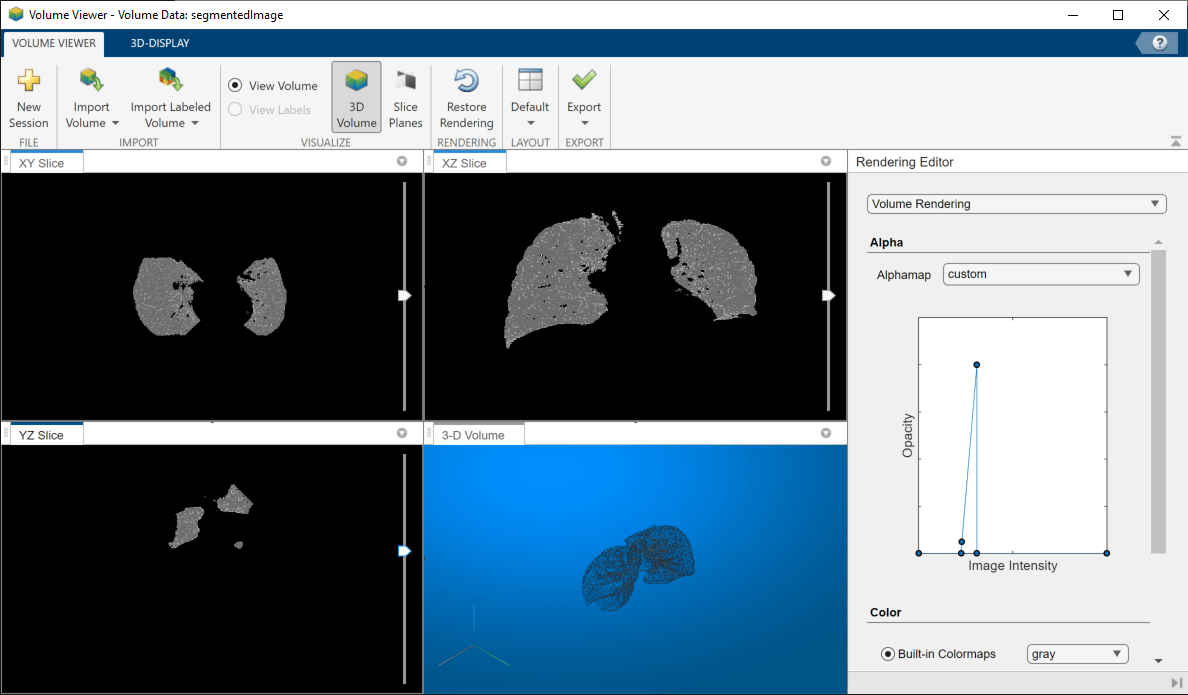 segmentedImage = V.*single(BW);View the segmented lungs in the Volume Viewer app.