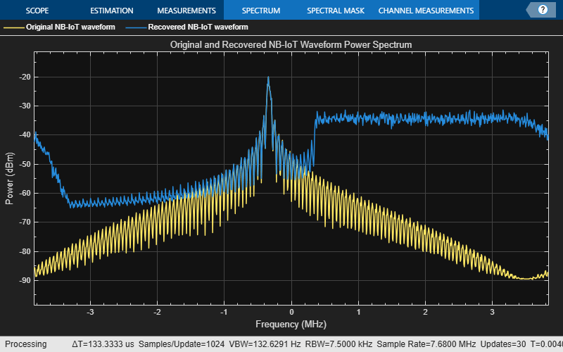 filteredSpecPlot = spectrumAnalyzer('SampleRate',lteInfo.SamplingRate,'Title','Original and Recovered NB-IoT Waveform Power Spectrum', ... 'ChannelNames',{'Original NB-IoT waveform','Recovered NB-IoT waveform'},'ShowLegend',true); filteredSpecPlot([nbiotWaveform,rxwave]);