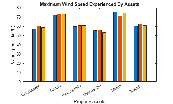 windSpeedfunction to calculate the maximum wind speed experienced by each property asset.Display the maximum wind speeds using a bar graph. Each bar represents a property asset. Group the bars according to city.