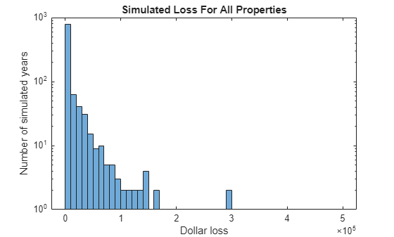 figure histogram(yearlyTotalDollarLosses) title("Simulated Loss For All Properties") ylabel("Number of simulated years") xlabel("Dollar loss") yscale log