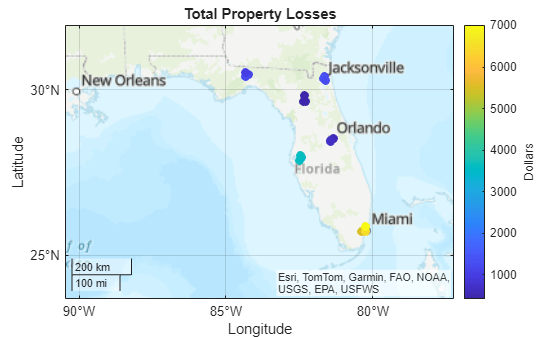 figure geobasemap topographic geoplot(assets,ColorVariable="TotalPercentileLosses",MarkerSize=20) c = colorbar; c.Label.String = "Dollars"; geolimits(latlim,lonlim); title("Total Property Losses")