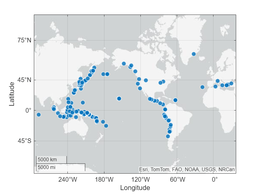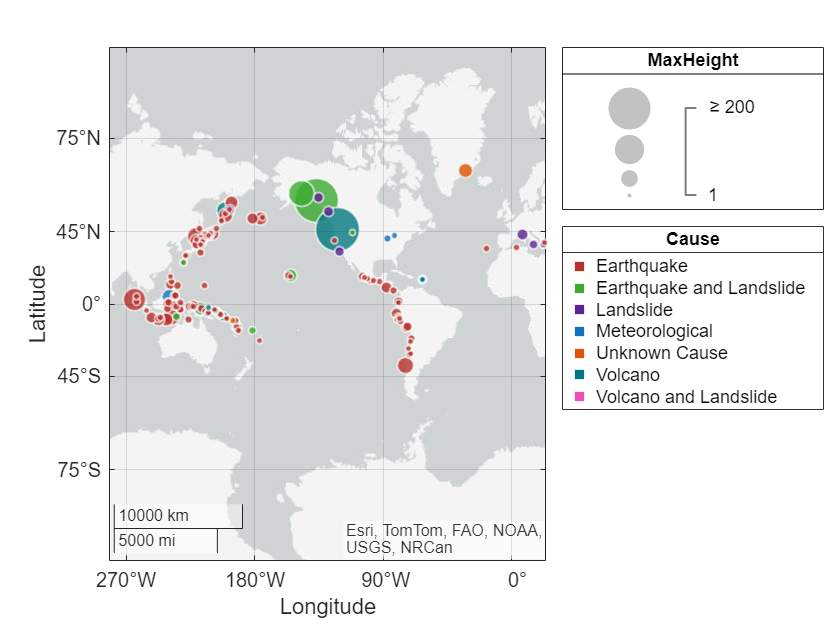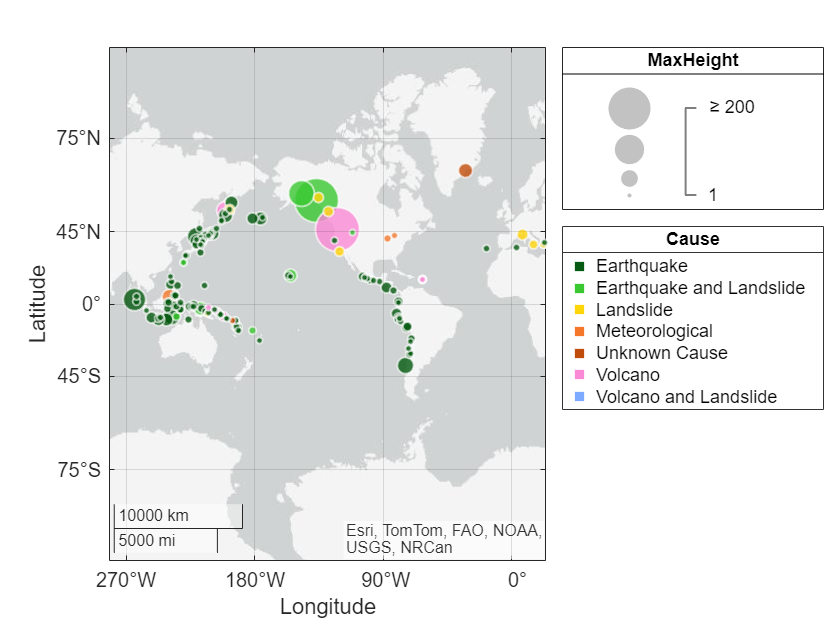 'categorical', {'Low', 'Medium', 'High'});La propiedad BubbleColorList controla los colores utilizados para las burbujas en la gráfica de burbujas geográfica. El valor es un arreglo m por 3 en el que cada fila es un triplete de color RGB. De forma predeterminada, geobubble utiliza un conjunto de siete colores. Si tiene más de siete categorías, los colores se repiten de manera cíclica. Para cambiar los colores empleados, utilice una de las otras funciones de mapa de color de MATLAB®, como parula o jet, o especifique una lista personalizada de colores.