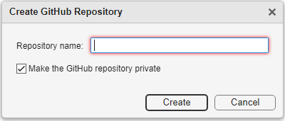 Create GitHub Repository dialog box. Repository name field and a checkbox to make the repository private, and Create and Cancel buttons below.