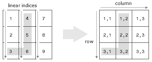 [ devuelve los arreglos row,col] = ind2sub(sz,ind)row y col que contienen los subíndices de fila y columna equivalentes correspondientes a los índices lineales ind para una matriz de sz. Aquí, sz es un vector con dos elementos, donde sz(1) especifica el número de filas y sz(2) especifica el número de columnas.